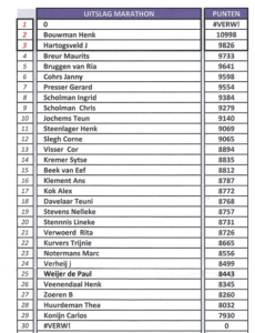 Klik op de afbeelding hieronder voor een vergroting van de uitslag van de klaverjasmarathon.